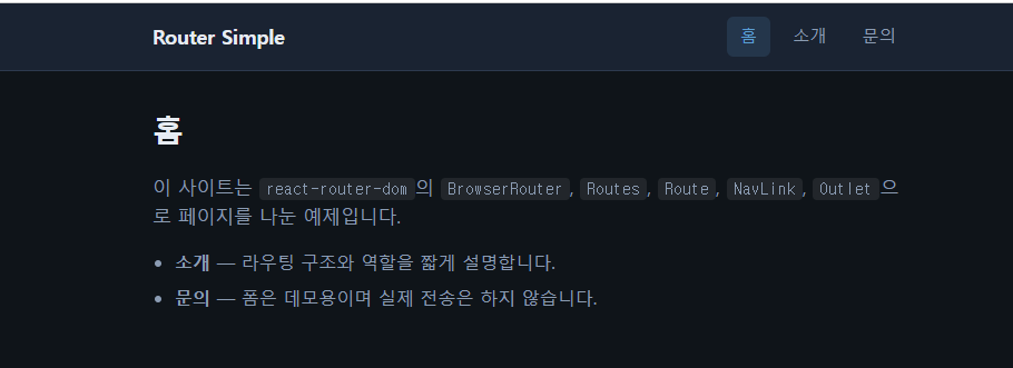 NavLink의end:to="/"일 때/about에서는 홈 링크가 활성으로 남지 않게 정확히 일치할 때만 active 처리합니다.Contact:onSubmit에서preventDefault후 로컬 state만 바꿉니다. API 호출 없음 (연습용).NotFound: 정의되지 않은 경로용;Link to="/"로 홈 복귀.